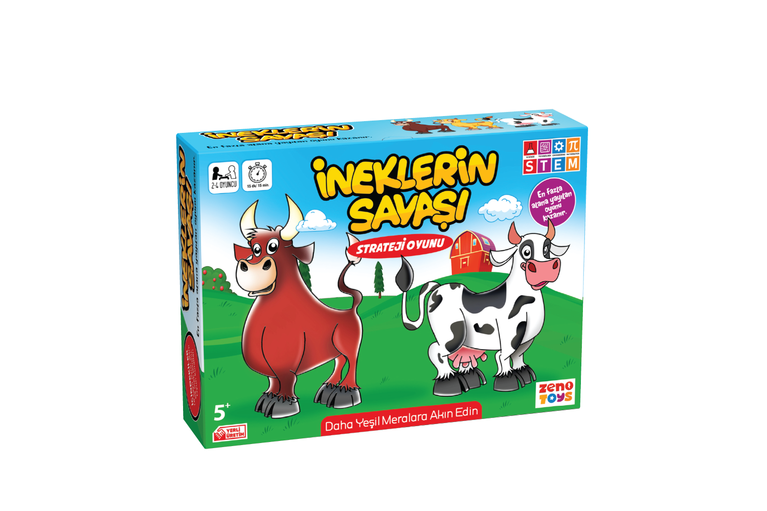 Tüm ailenin bayılacağı, çok hareketli bu stratejioyununda birbirlerine rakip, inek sürüleri düzbir doğrultuda ilerleyerek yeni çayırları elegeçirmeye çalışacaklar!Oyunun amacı inek sürünüzü en geniş çayırlarayayabilmektir. Sırası gelen oyuncu ineksürüsünü istediği oranda ikiye ayırarak düz birhat boyunca en uzak çayıra ilerletir.Tüm sürülerin dağılışını gizlice inceleyiprakiplerinizin etrafını kendi inekleriniz ileçevreleyerek daha fazla yayılmalarını önleyecekhareket planınızı yapın!Yeni oyuna başlarken farklı bir oyun alanıoyuncular tarafından oluşturulduğu içinİneklerin Savaşı her yeni oyunda yepyeni birmaceraya sizleri götürüyor.